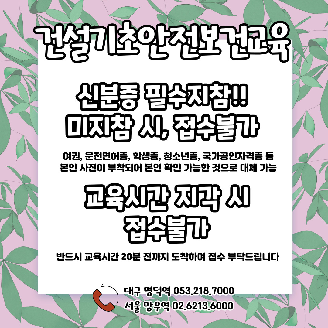 #건설기초안전보건교육 #건설기초안전교육 #대구기초건설안전교육 #명덕건설기초안전보건교육 #서울건설기초안전교육장 #망우기초건설안전교육장 #건설안전보건교육 #노가다안전교육 #대학생건설아르바이트 #건설업안전보건교육 #노가다안전교육장 #대구건설현장안전교육 #대구건설업안전보건교육 #단체출장교육가능
